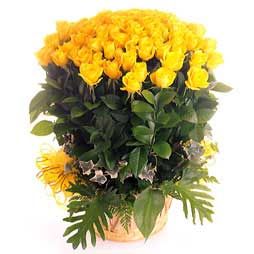 A traditional presentation, this long stem yellow roses in a basket are the perfect gift to send any time of the year. Roses are the perfect gift for all seasons and a classic presentation for any occasions.