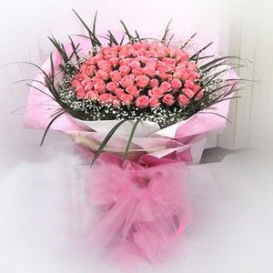 99 white and pink roses and baby-breath wrapped with pink bouqet