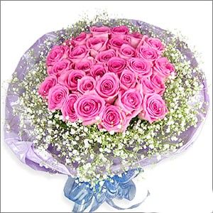 33 pink roses with baby breath bouquet wrapped with bouquet paper.