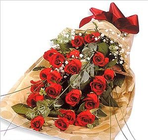 20 red roses with baby-breath and stylish greens wrapped with pink soft paper
