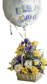 A terrific gift for a new baby boy. A basket full of flowers is finished with 1 mylar and 3 multi-colored latex balloon in an impressive display. The arrangement includes purple iris, white lisianthus, yellow alstroemeria and more. Balloon design will not avaiable due to local market in da lat city vary.