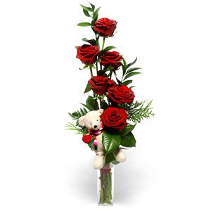 6 elegantly red roses arranged in a tall display and being loved by the cutest little bear