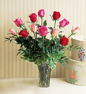 One dozen long-stemmed, multi-colored roses accompanied by beautiful green foliage in a striking glass vase