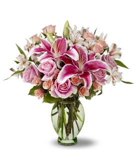 Peach spray roses and pink variegated roses, pink alstroemeria and Stargazer lilies –