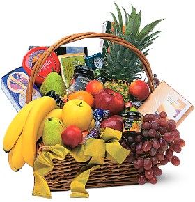 Apples, bananas and pears, along with cheeses, chocolates and crackers