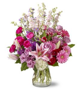 Happy Mother Day Saigon Flower Shop delivery to all District in Ho Chi Minh City Vietnam Almost a dozen different varieties of fresh flowers in pretty shades of pink, red, white and purple create a sweet symphony of color in this stunning floral arrangement thats two feet tall, and just as wide. This work of art includes roses, lilies