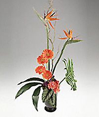 A linear composition of birds of paradise, gerbera, and sculptural foliage arranged with a dramatic flai