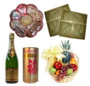 2 square rice cakes 1 box of combination candies 1 tea box 1 fruit basket 1 bottle of Champagne