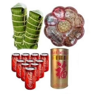 TET GIFTS 24 can of Coke 2 banana rice cakes 1 box of combination candies 1 tea box