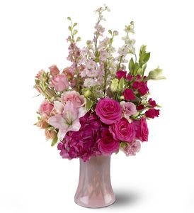 Is she one of the loveliest women you’ve ever known? Let her know with this stunning flower arrangement of pink lilies, salmon and pink roses and a range of towering blossoms and greenery, arranged in a glass vase
