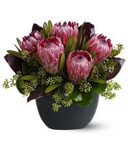 With their velvety, blushing buds and exotic jungle style, pink mink protea create a true style statement! And this fabulous floral arrangement of five pink protea - accented with seeded eucalyptus and glossy green leaves - is not your everyday bouquet. Send this wild gift to the special guy in your life, and he'll be secretly flattered by the attention.