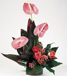 A high-style tropical arrangement containing anthuriums and roses is sure to set the mood and lift the spirits for anyone with modern tastes