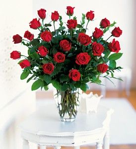 Two dozen red roses in a classic glass vase.